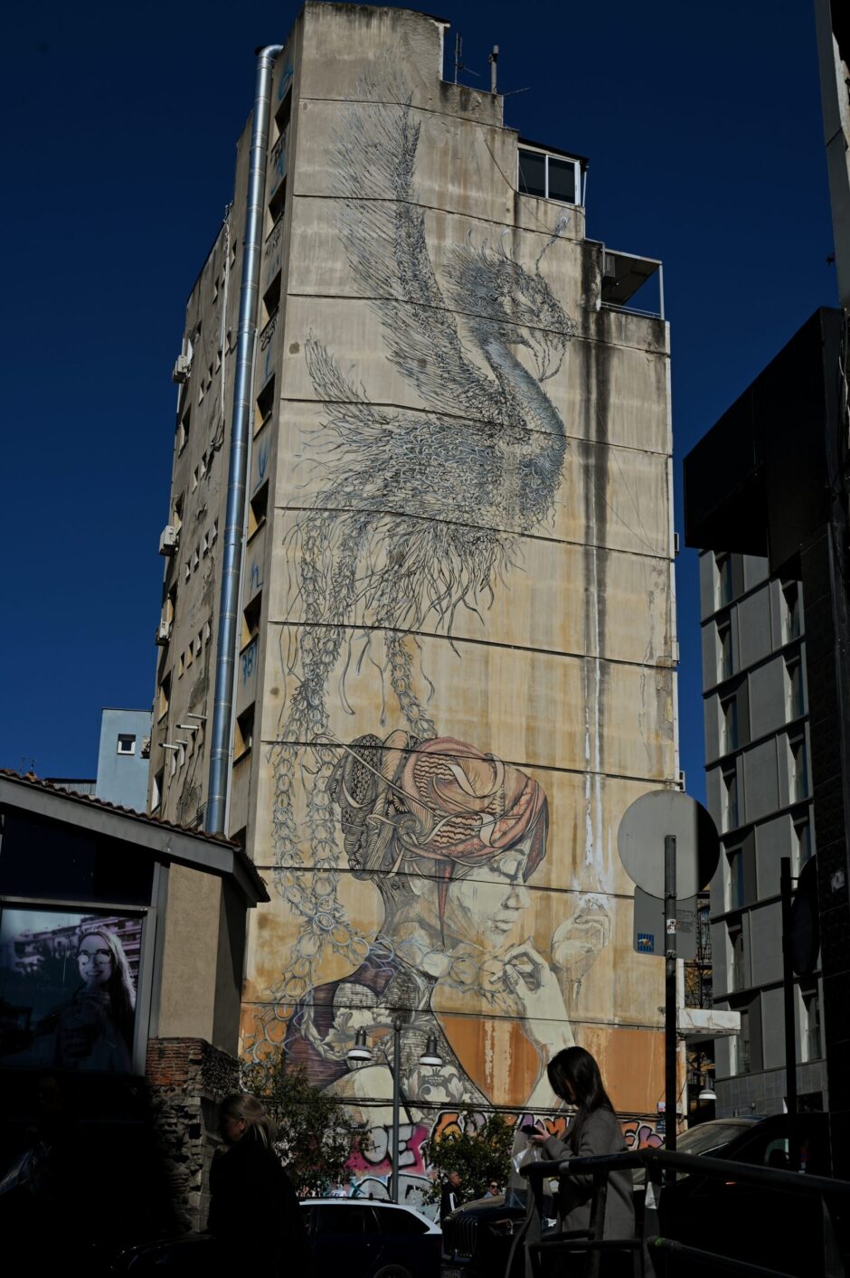 Among the murals that have lastingly marked the city, two deserve particular attention. On Tsimiski Street, a work created during the 15th Biennale of Young Artists in 2011, a collaboration between Chinese artist DAL and South African Faith47, carries a message against violence towards women. Its presence on such a busy thoroughfare gives it a visibility and political weight that no museum could have provided. That same year, Italian artist BLU created a mural directly inspired by the Greek economic crisis. Both works illustrate how Thessaloniki has positioned itself as a space for global artistic dialogue, capable of attracting international artists while remaining rooted in its local reality.