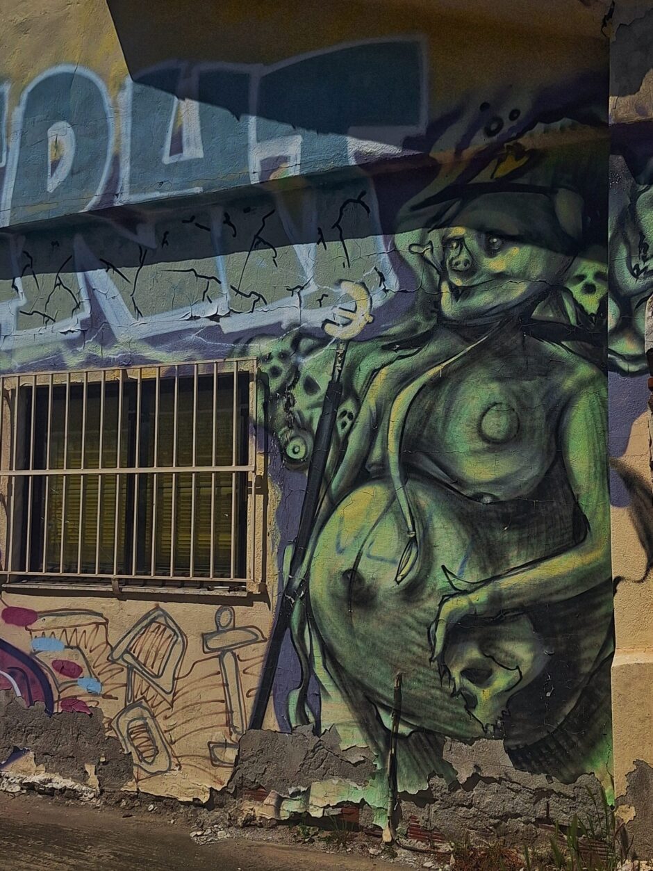 Thessaloniki’s street art scene developed in fertile ground: a young, student-driven, politically engaged city, shaped by an economic crisis that fundamentally transformed its relationship with public space. The densest concentrations of works are often found in marginal spaces — along railway fences, in the port areas to the north of the city — spaces long neglected by public authorities, which have paradoxically become the most vibrant galleries in the city.